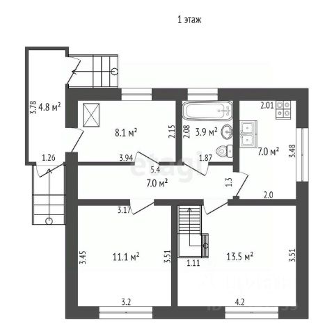 На первом этаже расположены просторная гостиная площадью 25.5 м2, кухня 17.2м2, санузел 5.9м2, коридор с гардеробной зоной 7.3м2, кладовая комната под лестницей.