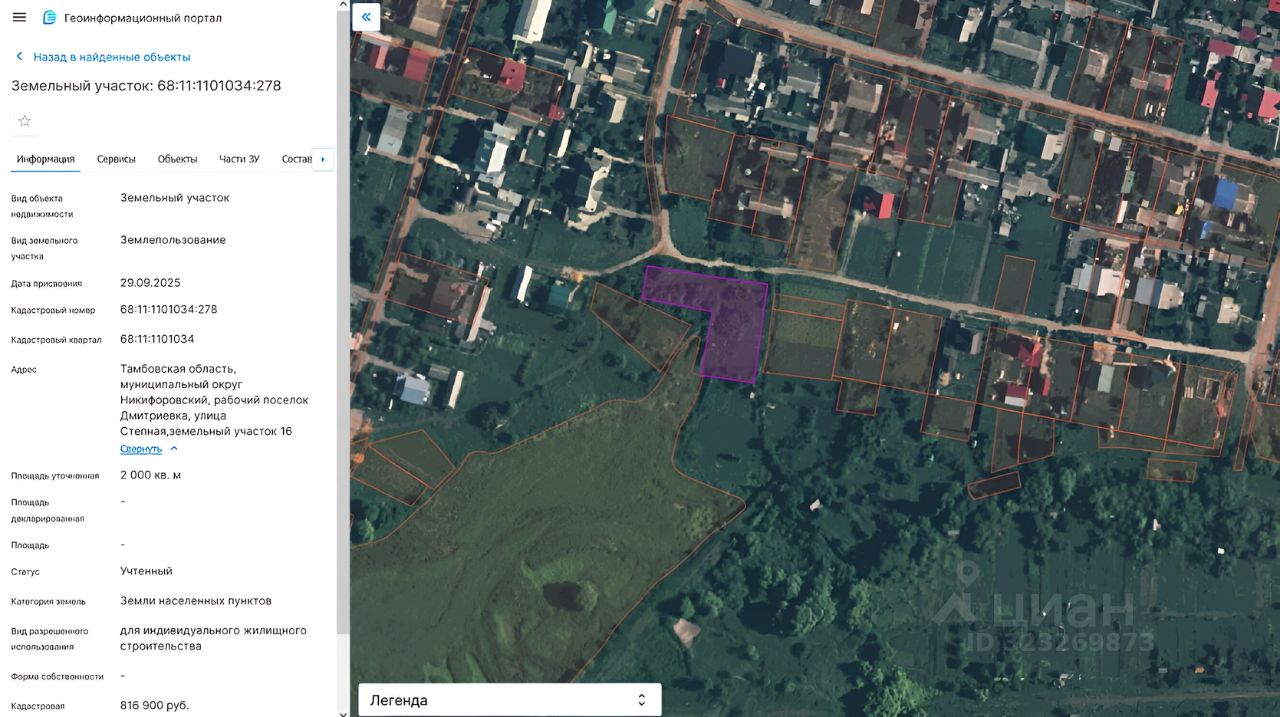 Земельный участок с кадастровым номером 68:11:1101034:278 общей площадью 2000 кв.м, расположенного по адресу: Тамбовская область, муниципальный округ Никифоровский, рабочий поселок Дмитриевка, улица Степная, земельный участок 16, относящегося к землям населенных пунктов, вид разрешенного использования: для индивидуального жилищного строительства