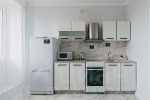 плита, духовой шкаф, холодильник, микроволновая печь, чайник, набор посуды;