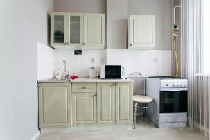 плита, духовой шкаф, холодильник, микроволновая печь, чайник, набор посуды;