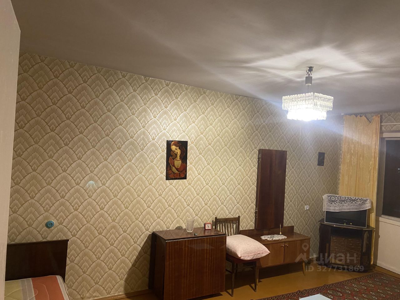 Комната светлая, с диваном и шкафом для хранения вещей. Из мебели также имеется стол и стул.