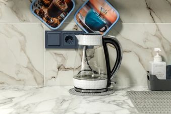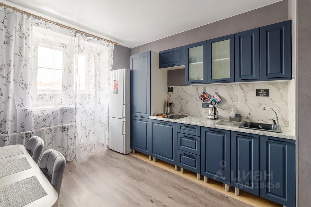 — плита, духовой шкаф, холодильник, микроволновая печь, чайник, набор посуды;