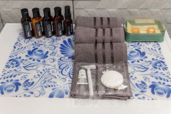 — ванна или душевая кабина, стиральная машина, полотенца, шампунь, мыло, фен, сушилка, гладильная доска.