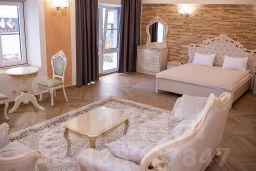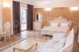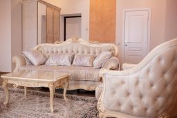 Роскошный номер люкс с кроватью queen-size, собственный балкон, великолепный диван, кресло, кофемашина для зернового кофе, кондиционер, холодильник телефон связь с ресепшеном (рум сервиз), телевизор full HD, дублирующий выключатель света у кровати, зеркало, трюмо, большая туалетная комната и просторная душевая комната