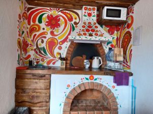 Это одноэтажный дом, оснащенный двумя спальными комнатами, кухней, совмещенной обеденной зоной, летней террасой с мангалом. Главная достопримечательность дома - имитация настоящей печи с подогревом, которая также является спальным местом.