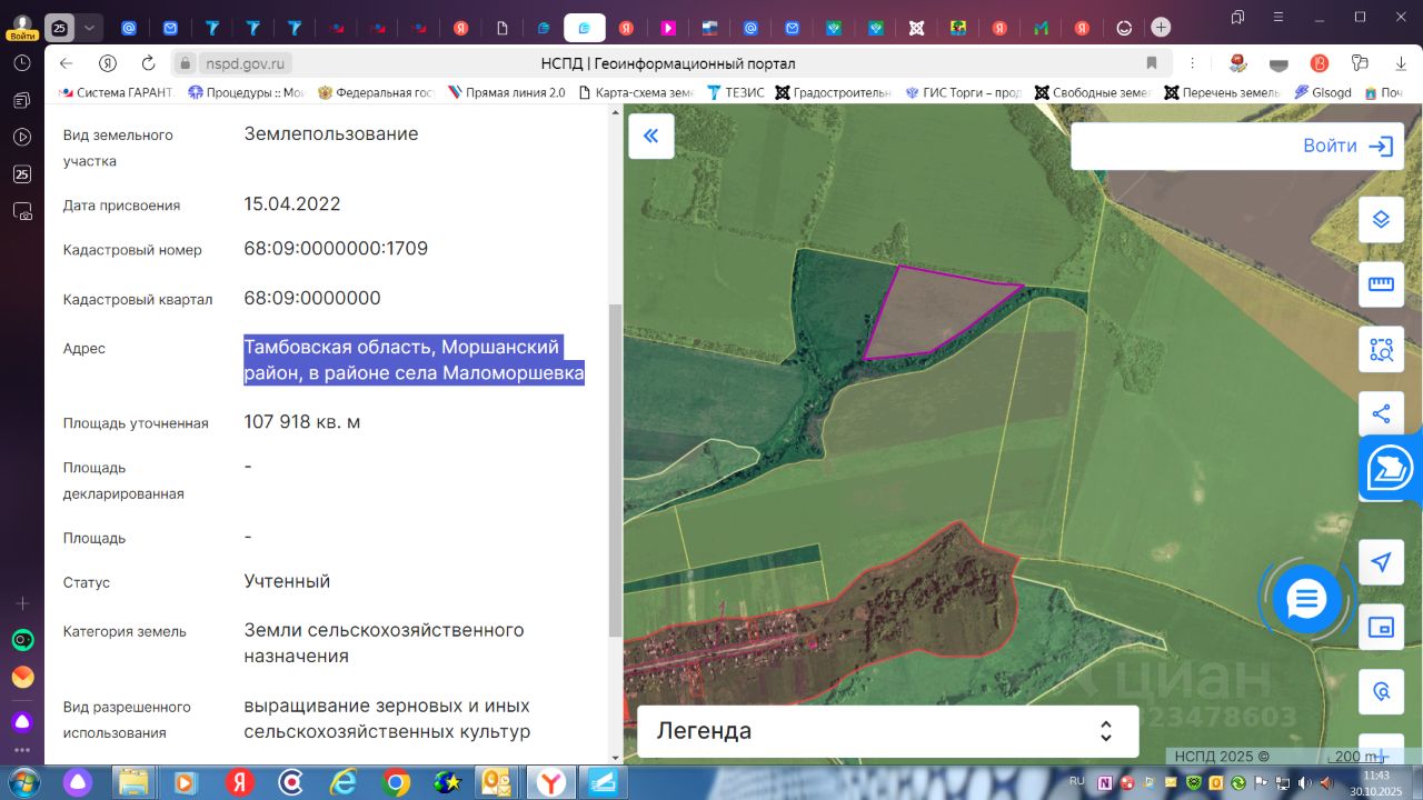 Земельный участок с кадастровым номером 68:09:0000000:1709 общей площадью 107918 кв.м, разрешенное использование: выращивание зерновых и иных сельскохозяйственных культур, расположенный по адресу: Тамбовская область, Моршанский район, в районе села Маломоршевка, относящийся к землям сельскохозяйственного назначения