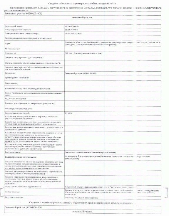 ЛОТ 4: Земельный участок, кадастровый номер 68:20:4016003:2, площадь 960 кв. м, категория земель: земли сельскохозяйственного назначения, вид разрешенного использования: для ведения садоводства, вид права: собственность, адрес объекта: Тамбовская область, Тамбовский район, СНТ Радуга, участок 26