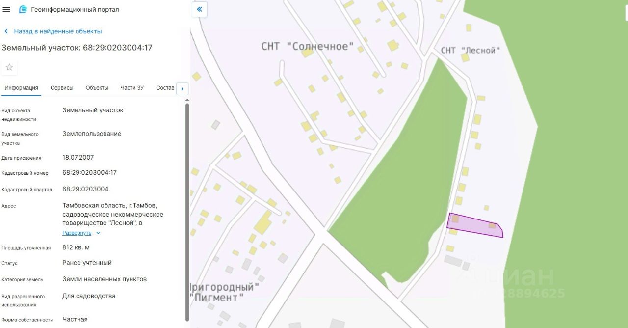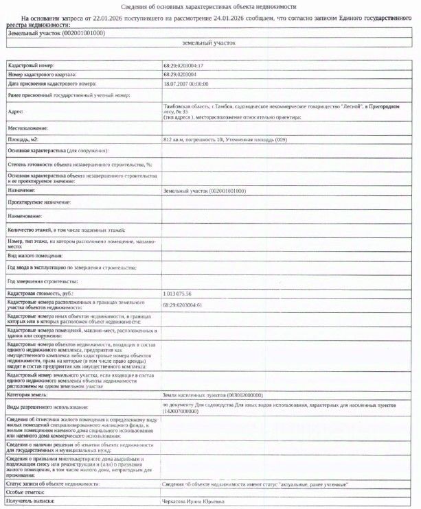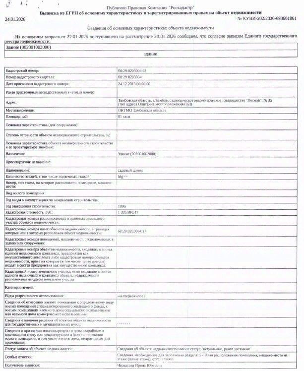 ЛОТ 5: Здание (садовый домик), кадастровый номер 68:29:0203004:61, площадь 81 кв. м, вид права: собственность, и земельный участок, кадастровый номер 68:29:0203004:17, площадь 812 кв. м, категория земель: земли населенных пунктов, вид разрешенного использования: для садоводства, вид права: собственность, адрес объекта: г. Тамбов, СНТ Лесной, в Пригородном лесу, 35