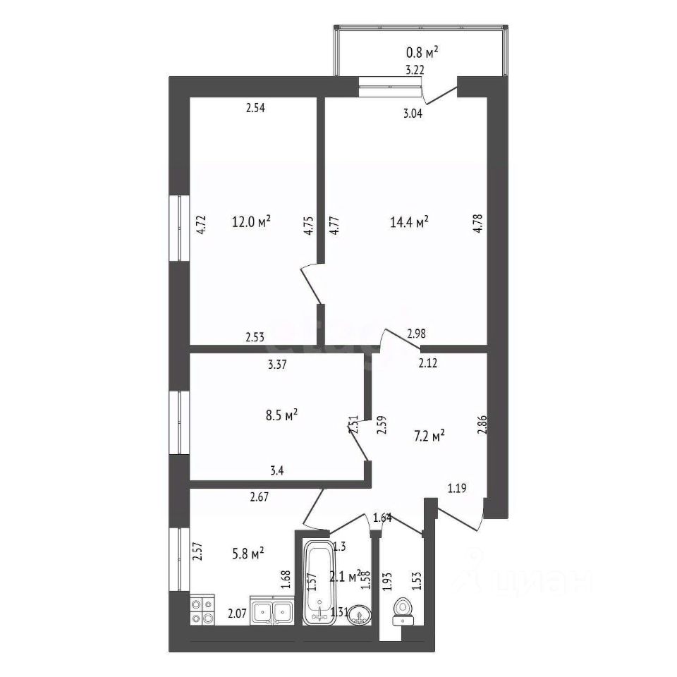 Общая площадь квартиры 51,4 м².