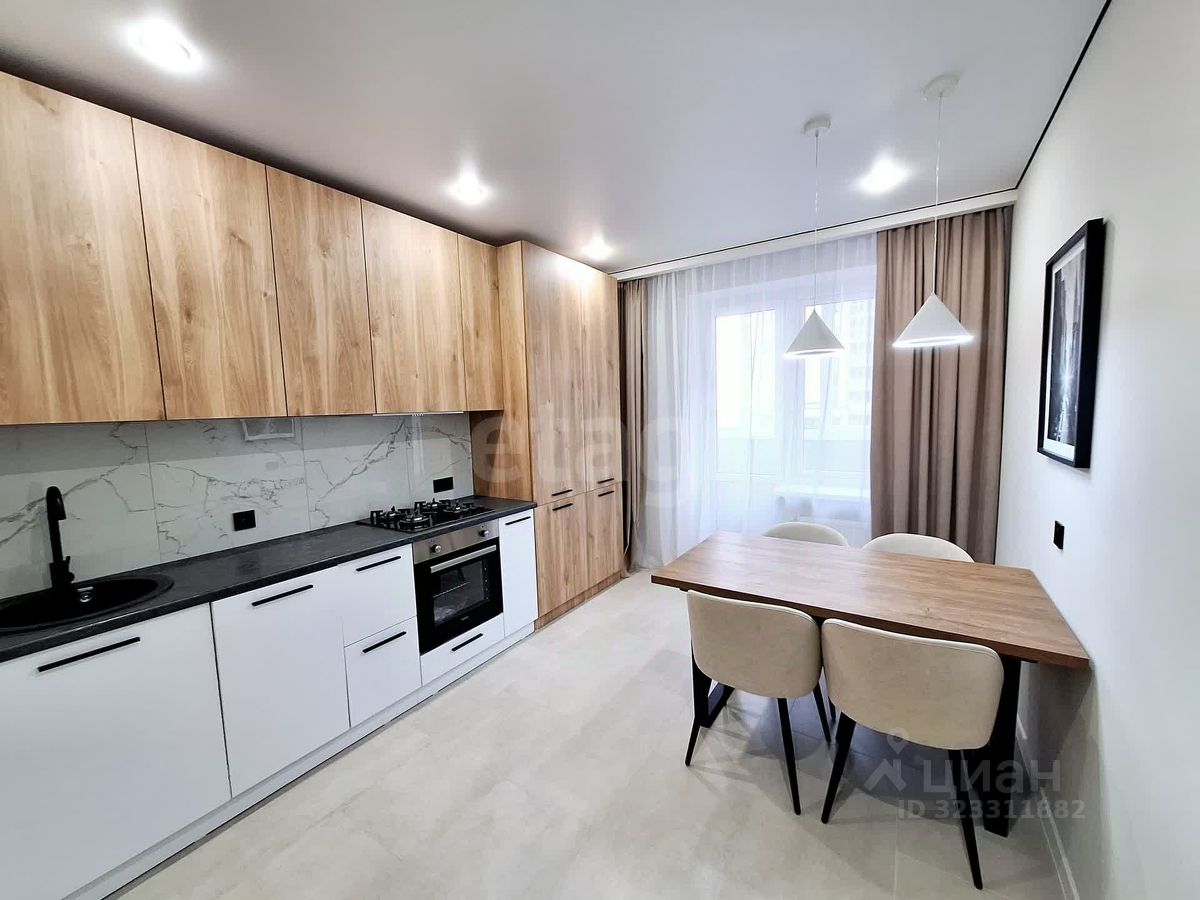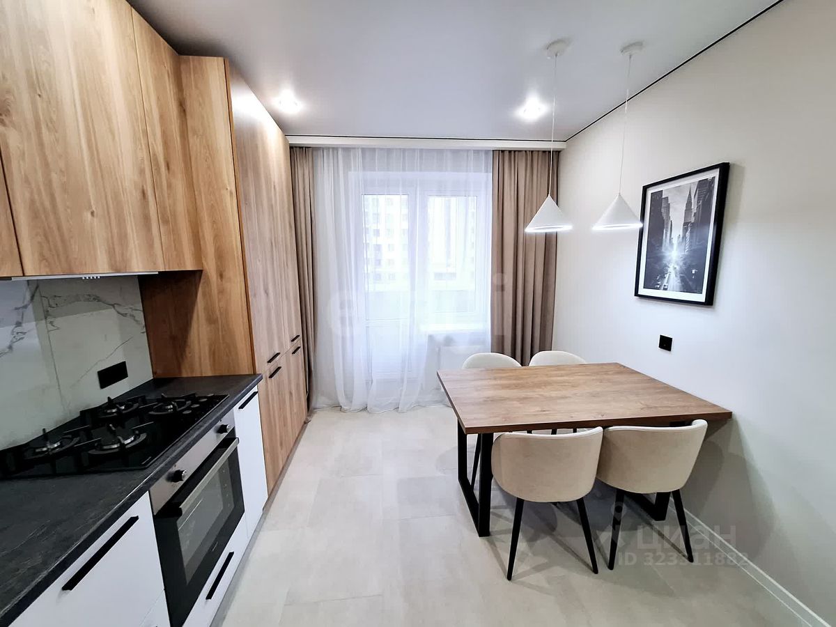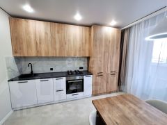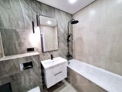 Светлая кухня с выходом на балкон, создает ощущение простора и комфорта, а ванная комната снабжена всеми необходимыми удобствами.