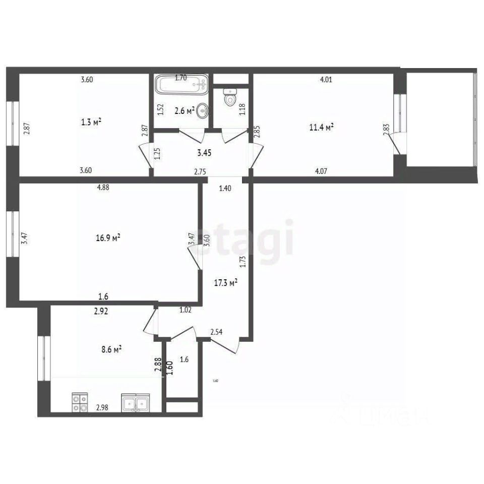 Общая площадь: 62.7 м².