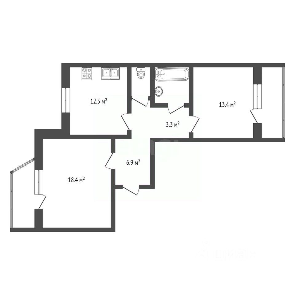 Общая площадь квартиры составляет 59,1 кв.м. Жилая площадь: 32 кв.м. Комнаты : 18,5 кв.м. и 13,5 кв.м. Площадь кухни: 12,5 кв.м.