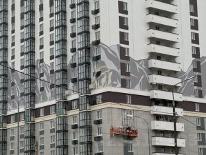 Дизайнерский холл, фасад будет из керамогранита и декоративной штукатурки с изображением леса, гор и неба, 4 лифта,
