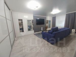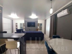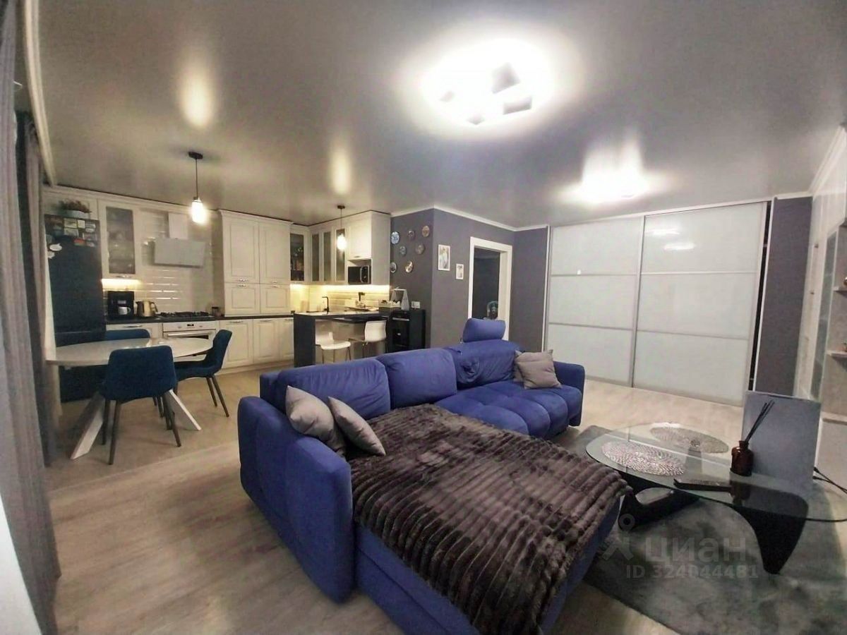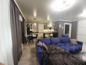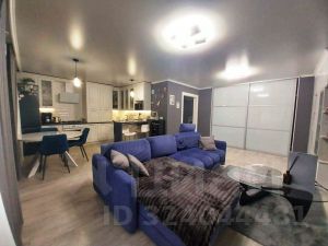 Просторная кухня-гостиная с современным приёмом зонирования на обеденную и гостевую зоны, а также выходом на лоджию. Тёплый пол на кухне.
