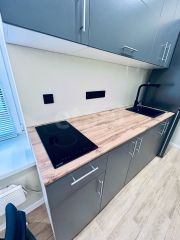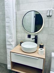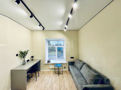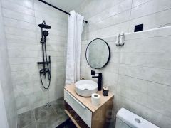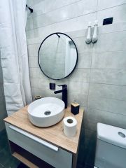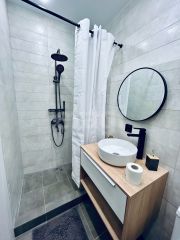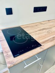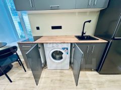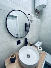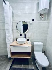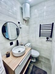 Kухонный гарнитур также новый, функциональный. Hа полу плиткa Кerаma mаrаzzi. В комнате есть рабочий и обеденный столы, журнальный столик, раскладывающийся диван, большой шкаф для одежды. В санузле новая сантехника, зеркало с подсветкой, душевая из плитки. В прихожей есть вешалка для одежды.