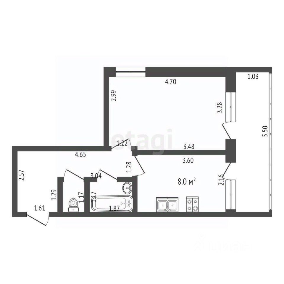 Площадь квартиры 34,1 кв.м. Площадь кухни - 7,8 кв.м, комната - 15,4 кв.м, санузел раздельный.