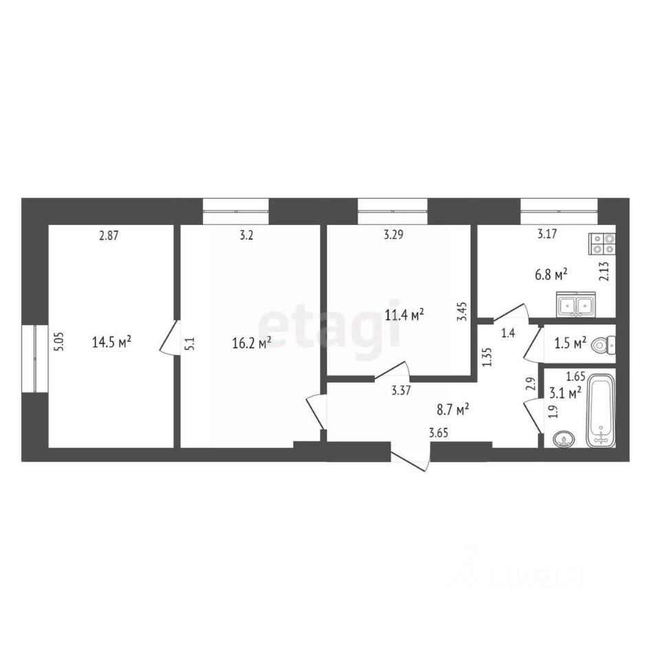 Трехкомнатная квартира площадью 62,2 м² расположена на втором этаже трехэтажного кирпичного дома в центре города. Объект находится в частной собственности, оформлен на одного владельца. Планировка включает две спальни (14,5 м² и 11,4 м²), гостиную (16,2 м²), кухню (6,8 м²), прихожую (8,7 м²), раздельный санузел (ванная 3,1 м² и туалет 1,5 м²). В квартире выполнен косметический ремонт, установлены пластиковые окна, газовая колонка, мебель остается по договоренности.