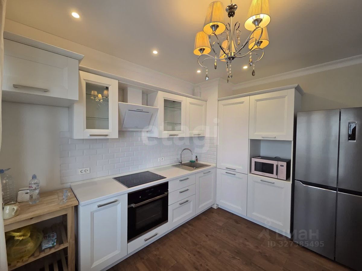 Кухня полностью укомплектована: здесь остается современный кухонный гарнитур с встроенной техникой, включая холодильник Side by Side с распашными дверями, микроволновую печь, варочную панель и духовой шкаф. Также имеется обеденный стол со стульями для комфортных семейных ужинов. Из кухни есть выход на застекленную лоджию, где можно наслаждаться видами города.