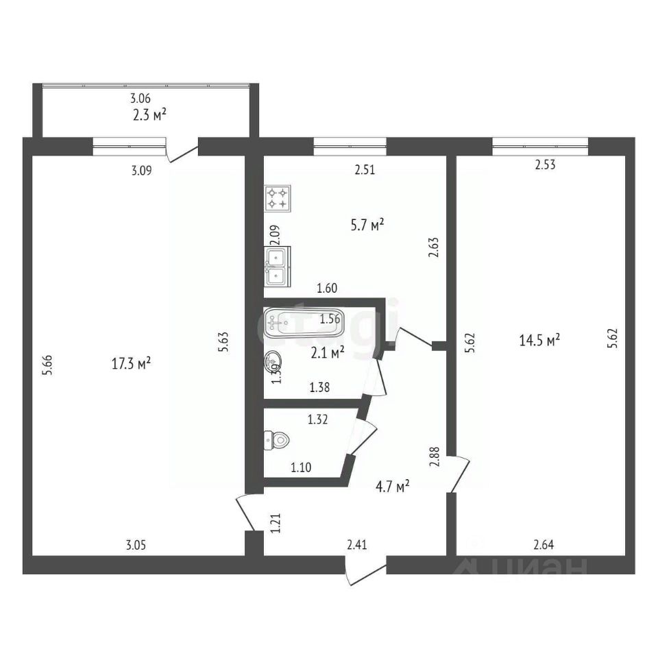 Общая площадь составляет 45,2 кв.м.