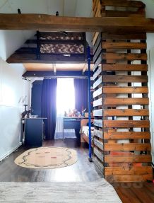 на втором этаже комната во весь этаж, утеплена. сделан качественный ремонт со встроенными в стену шкафами.