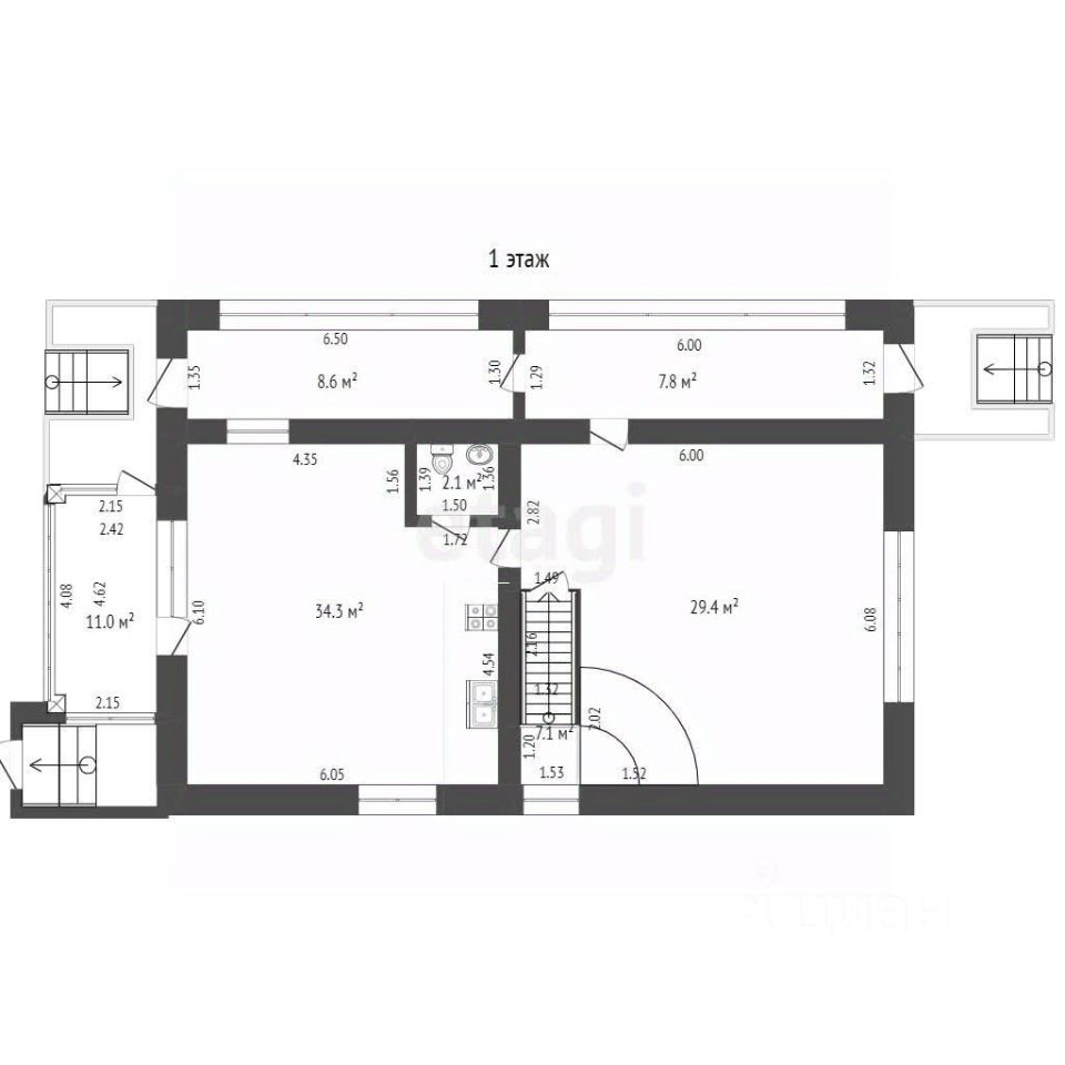 На первом этаже просторная уютная гостиная, кухня совмещенная со столовой, санузел. Рабочая зона на кухне - теплый пол. Основное покрытие пола - паркет. Два выхода центральный и на задний двор.