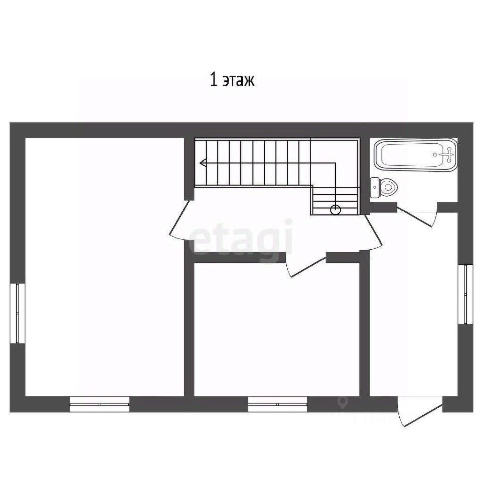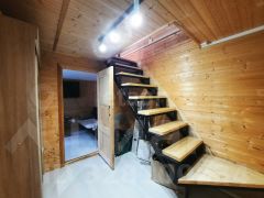 На первом этаже-прихожая, совмещенный санузел, лестница, спальня, кухня-гостиная.